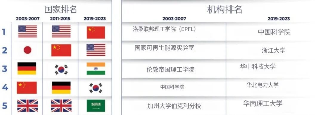 在21世纪初,领先机构包括洛桑联邦理工学院、美国国家可再生能源实验室、帝国理工学院(排名第3)。中国科学院迅速追赶了这些先驱机构,2013年在累计发表量上占据该领域的榜首。历史排名数据显示,前5名的机构来自多个国家,但近五年排名前5的机构以中国为主。