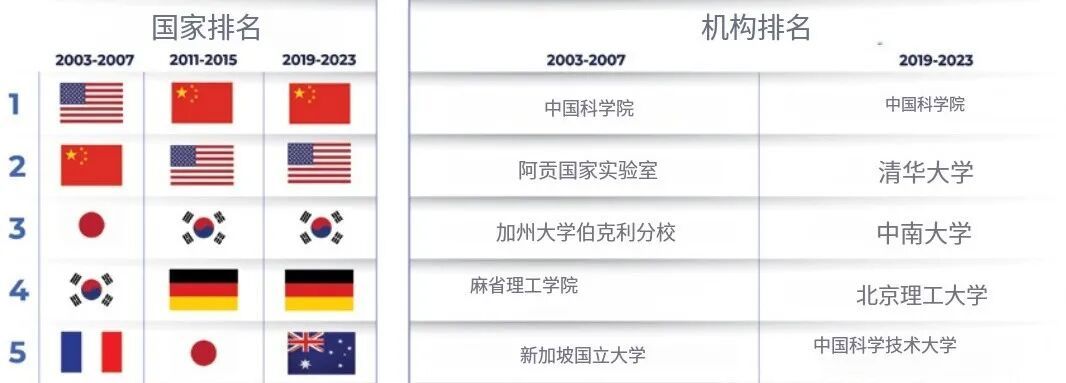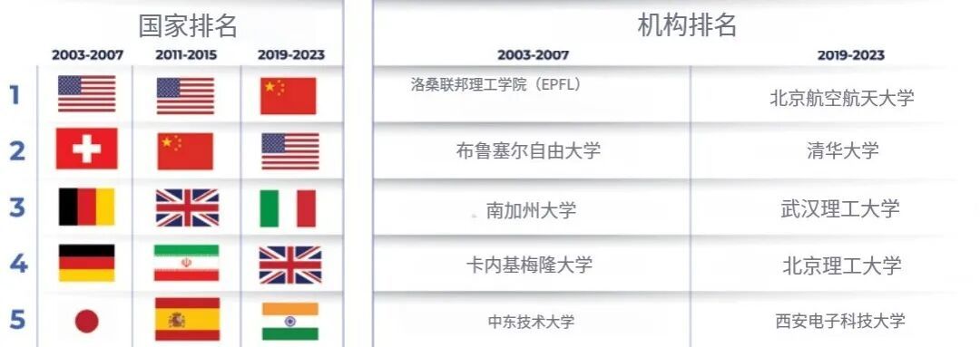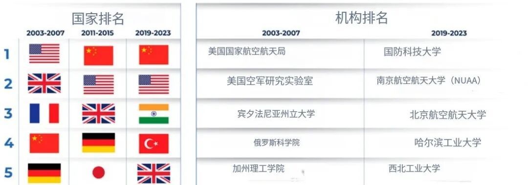 2003-2007年,排名靠前的机构多为政府或政府附属机构(如NASA、美国空军研究实验室),这些机构在2019-2023年的排名大幅下滑,中国机构占据主导地位。2019-2023年排名第1的是中国人民解放军国防科技大学,其他4家中国机构均属于“国防七子”。