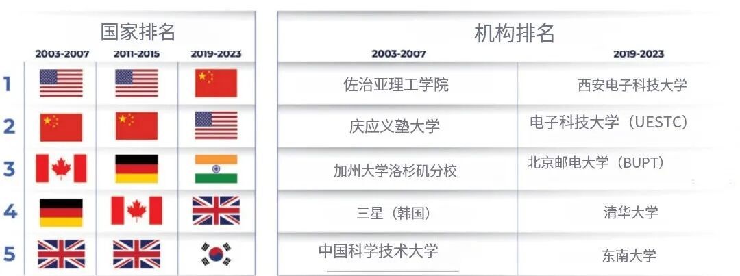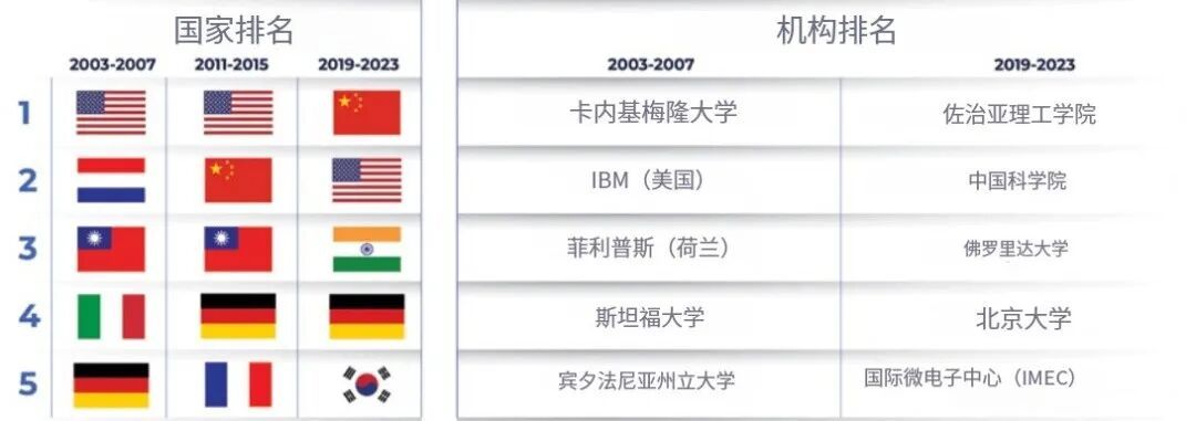2003-2007年排名第1的美国佐治亚理工学院,整体表现仍较强劲(2019-2023年排名第7),但较2004年(占该年度研究的近20%)大幅下滑。2003-2007年排名前5的机构中,三星是极少数的非美国企业。近期排名第1的西安电子科技大学隶属于中国教育部,同时由中国国家国防科技工业局和中国电子科技集团公司(CETC)共建。中国电子科技集团公司专注于国防电子技术,其多家子公司及芯片技术被列入美国和日本的制裁清单。