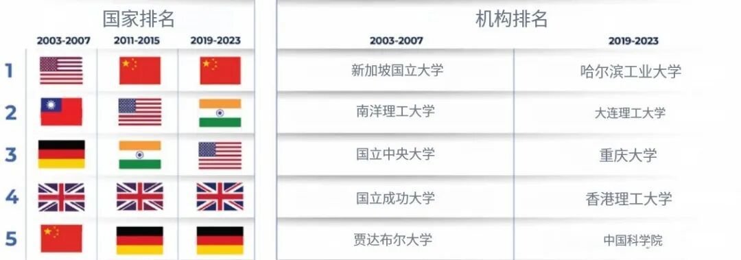 在2003-2007年,发表排名前10名的机构主要来自新加坡和中国台湾;2019-2023年,前5名机构均来自中国(仅印度理工学院孟买分校排名第10、印度理工学院鲁尔基分校排名第14为非中国机构)。新加坡国立大学曾是2003-2007年的全球领先机构,2011年高影响力发表量达到峰值后回落至平均水平,目前排名第28名。大连理工大学、香港理工大学、中国科学院等近期表现强劲的机构,发表量均稳步提升。哈尔滨工业大学的变化最为显著,从2003-2007年的第16名跃升至榜首。该机构自2020年起被列入美国制裁名单,是中国最重要的国防大学之一,在先进航空发动机领域也排名靠前。