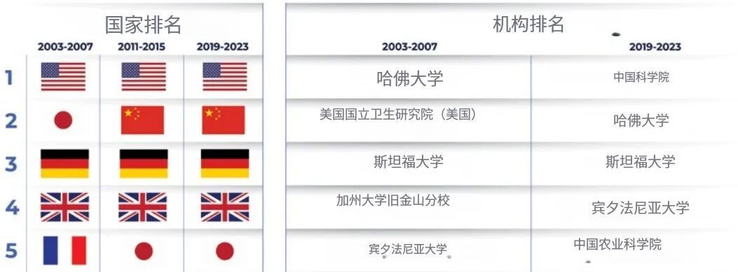 前5名机构的趋势与国家趋势大致一致:美国机构早期领先,21世纪10年代初开始适度提升高影响力发表量;中国科学院和中国农业科学院则持续增强实力。近年来,中国科学院的发表量已超越美国同行,近五年在基因工程领域的高影响力研究发表量最多。美国国内的领先机构则保持得相对稳定,哈佛大学、斯坦福大学、宾夕法尼亚大学均在2003-2007年和2019-2023年的前5名中。