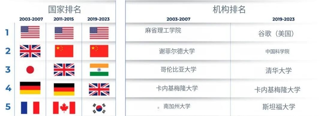 2010年以前,自然语言处理领域的科研由少数美国机构主导,包括卡内基梅隆大学、麻省理工学院、微软等,在2003-2007年的前五名中,谢菲尔德大学是唯一的非美国机构。2011年苹果Siri虚拟助手的成功推动了该领域的商业化应用。谷歌从2012年起也大幅提升了发表量,通过成立谷歌大脑(2011年)、收购英国初创公司DeepMind(2014年)等战略举措,谷歌在2017-2022年的高影响力发表量中跻身榜首。微软作为历史上的强势机构,曾在2011-2015年排名第1,但2016年后的表现略有下滑,这些年的整体产出排名第3。尽管美国在大型语言模型(如Sora、GPT-4)领域的优势彰显了其技术实力,但中国科学院和清华大学在2019-2023年跻身了前5名,体现出中国的追赶成效。